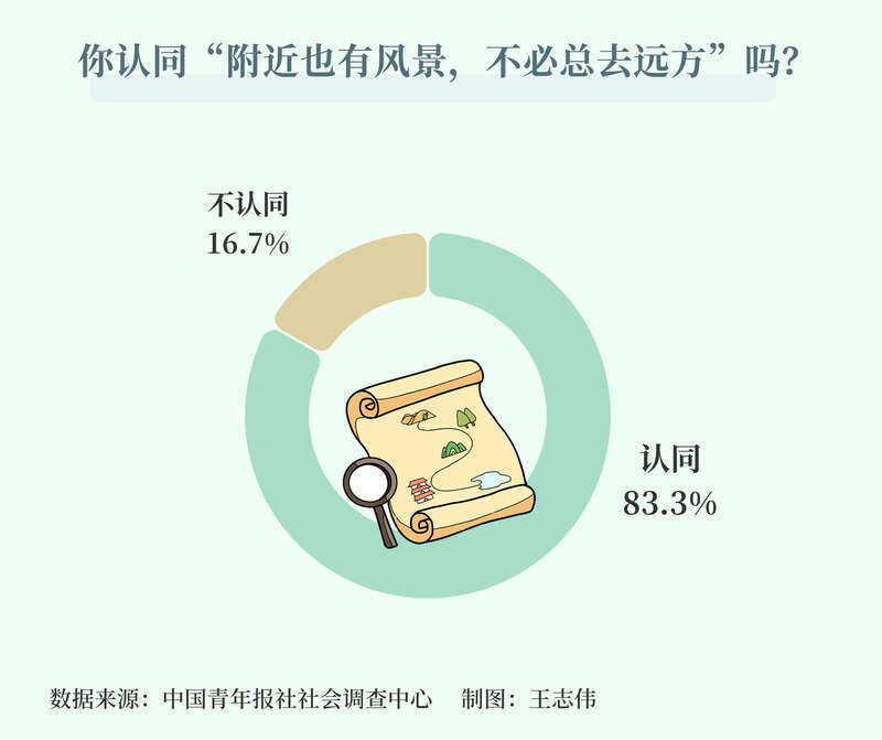 从追求“诗与远方”,到探索本地,越来越多年轻人开始留意身边的美。调查显示,83.3%的受访者认同“附近也有风景,不必总去远方”。